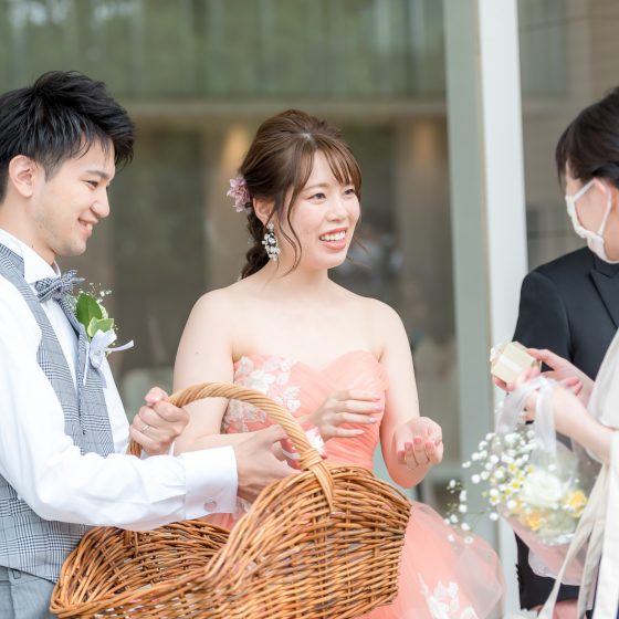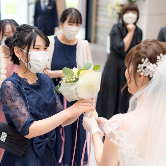 ブーケプルズは、全員が参加しやすいように両家の母も含めて行いました。また、一人だけにブーケ(プレゼント)を贈るわけではなく、リボンがつながっていなかった方々向けにも妻の職に関係のある品を準備しお渡ししました。