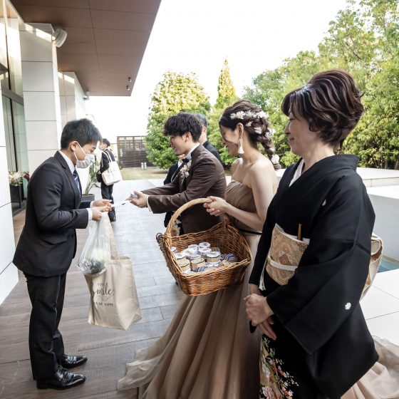 また、コロナ禍での式であったため、安心して参加していただけるように新婦がゲストの皆さまへアルコールシートやマスクケース、予備のマスクをそれぞれ準備させていただきました。