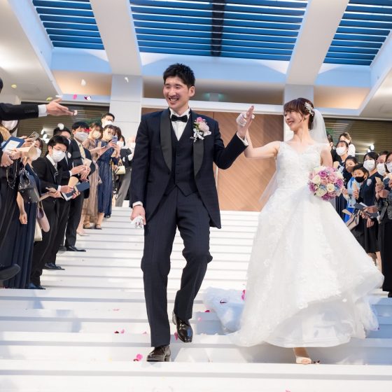 見学に伺って最初に目に入ってくる大階段とエントランスの明るさ・光の差し込むチャペルに心を奪われました。そして、何より全天候型なので天気に左右される事なく結婚式を出来る事も魅力の一つでした。