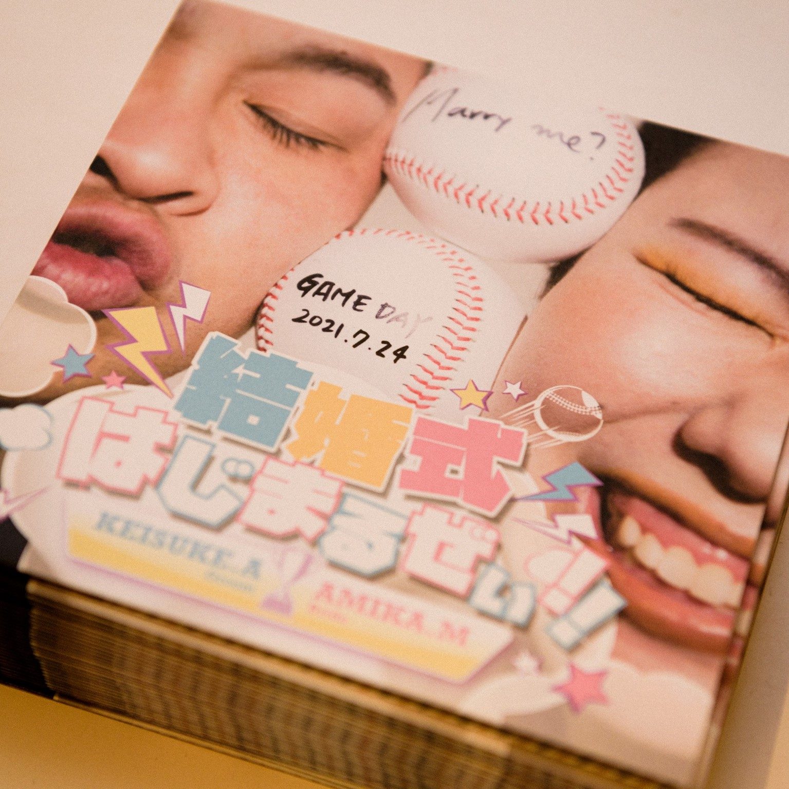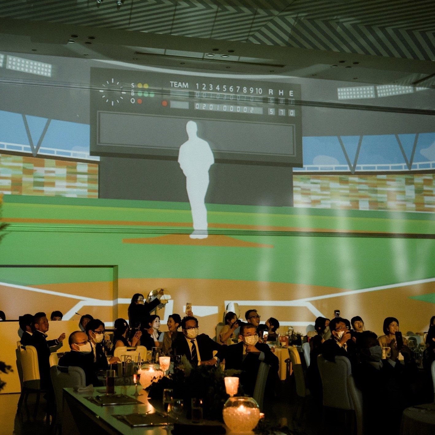 某野球チームファンの新郎に、プロジェクションマッピングで球場の映像を流す事を提案して貰い採用しました。担当の福田さんに実況をしてもらい、新郎がホームランを打つという演出にゲストも大爆笑でした(笑)