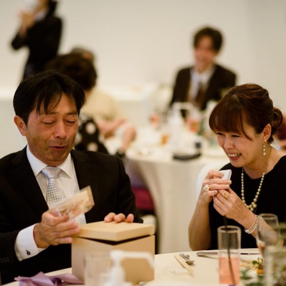ゲスト全員にミニメッセージカードとお菓子を用意。あえてよくある席札の裏のメッセージ等は用意せず、カードを用意しました(^^)再入場後にBOXオープンしてもらい、皆が読む姿を目の前で見れて準備は凄く大変でしたが、やってよかった演出です♪