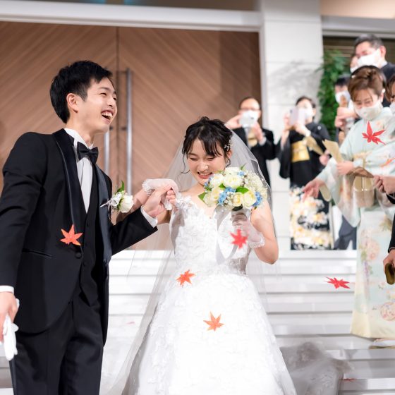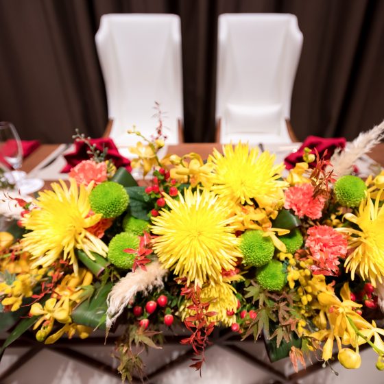 結婚式を挙げる日が、秋ということで、会場の雰囲気は秋をテーマに色合い等を考えました。秋ということで、フラワーシャワーではなく、紅葉シャワーにしたり、装花やヘアアレンジも秋らしくドライフラワーを使ってもらったりしました。秋の赤や黄色、オレンジといった温かい色合いが、会場にとてもよく合っていました。