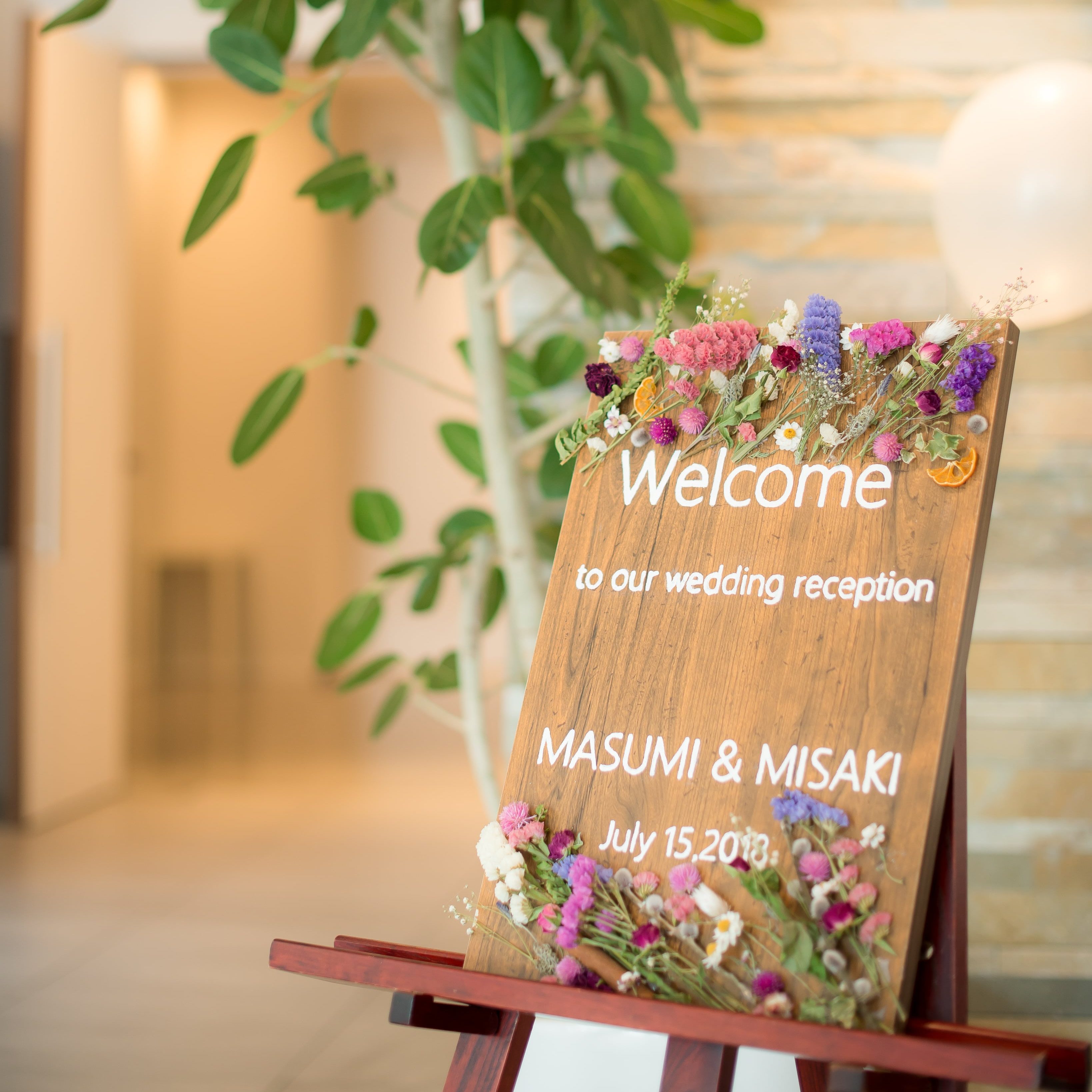 また、手作りにもこだわりました。ペーパーアイテムはもちろん、フォトプロップスやテーブルナンバー、受付サイン、ウェルカムドール、ウェルカムボード等を手作りし、お菓子まきやプチギフトのラッピングにもこだわりました。特にウェルカムボードは1枚の板を買って、ペンキで文字を書いたり、ドライフラワーで装飾したりと時間をかけて作りました。ウェルカムスペースは自分たちらしくオリジナリティのある空間にするため、前日の夜に自分たちで飾りつけをしました。結婚祝いに頂いたものを受付周りに飾るだけでなく、ゲストと撮った写真を飾ることで挙式までの時間も楽しんでもらえるような工夫をしました。手作りしたことで会場全体が私たち好みのナチュラルな雰囲気になり、大満足でした。手作りは大変でしたが、夫婦2人で協力して結婚式を作り上げることができ、それもまた良い思い出となりました。