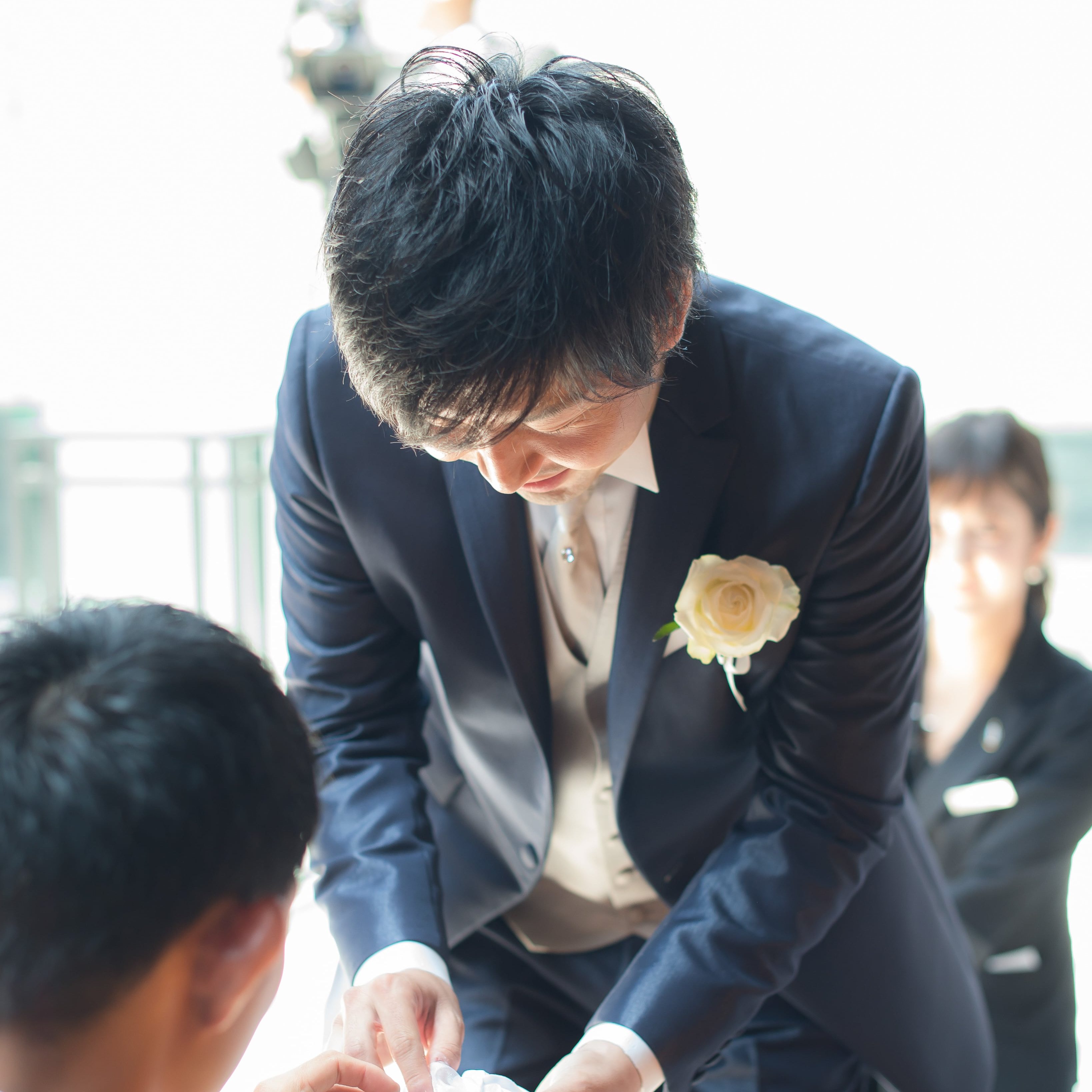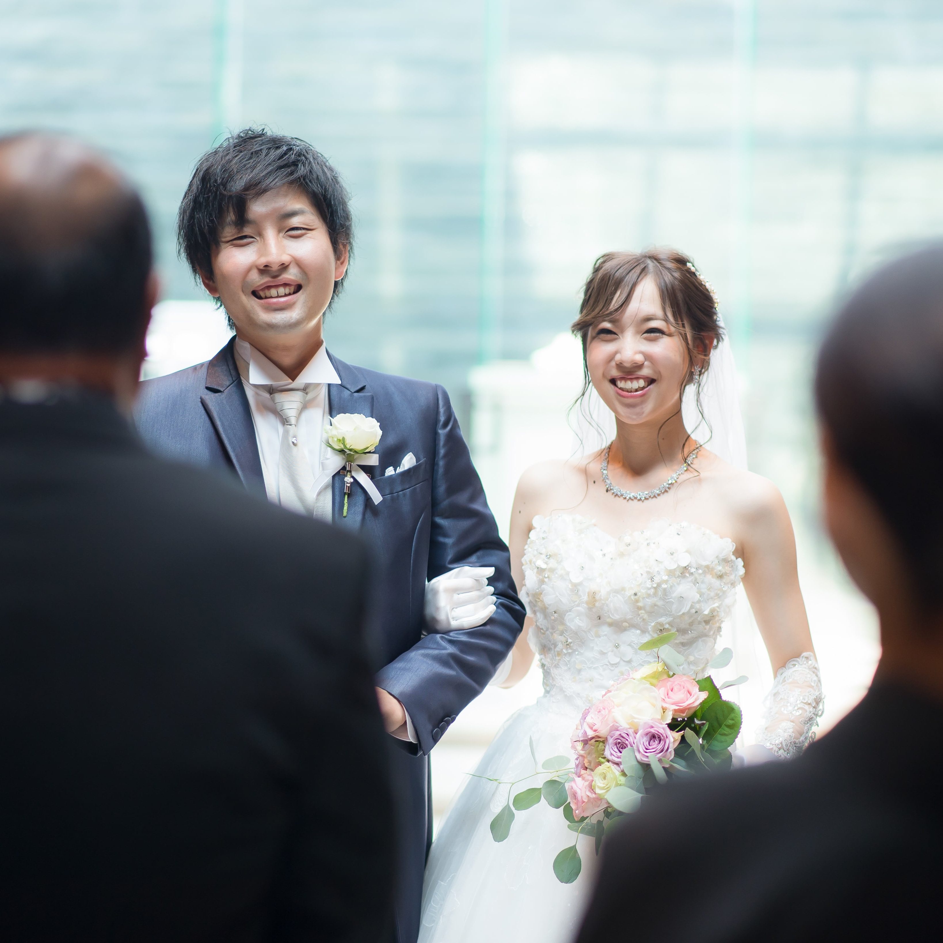 挙式は厳かな雰囲気の中で進行するのではなく、アットホームな雰囲気でゲストの方にも楽しんでもらえるよう参加型にこだわりました。挙式はキリスト教式でしたが、リングリレーやブーケブートニアセレモニーを取り入れ、今までとは一味違った印象に残る式にしていただきました。また、ゲストに子どもから年配の方まで幅広い年齢層の方がいたので、アフターセレモニーではゲストの方全員が参加できるよう、ブーケトスの代わりにお菓子まきを行いました。披露宴でもガーデンからの入場演出や大迫力のプロジェクションマッピング、お子様ゲストにも楽しんでもらえるようにプレイルームを設置したり、子どもカメラマンとして活躍したりしてもらいました。フォトラウンドではポーズカードを使用したため各テーブルごとにポーズが異なり、写真を見返していても楽しいのでおすすめです。