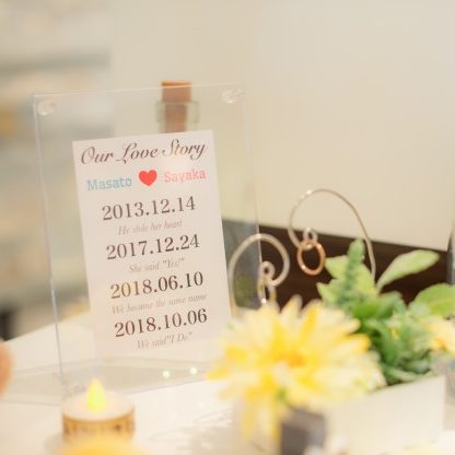 リーヴスでは全ての場所が自分たちの思うがままに出来ます!ウェルカムスペースはもちろんですが、窓やトイレまで飾り付けが出来ます。オリジナリティ溢れる、自分たちらしさいっぱいの空間を作ることが出来ます。そんなリーヴスで今までにない、印象に残るような式にしていなと思っていました(笑)こだわったのは、全て!!全て手を抜かず、全力で取り組みました。新郎は自分の理想の料理を。新婦はBGMを始め、飾り付けアイテム、演出・・・とことんこだわりました。特にBGMは担当者様が一番大変だったと思います。CD原本を持ち込み、使いたい曲を細かく指定したメモを貼って渡しました。余りの細かさに驚いていたのを今でも覚えています(笑)そんな我儘にも本気で取り組んでいただきました。様々な本気の思いに応えてくださったおかげで、当日は理想通りの素晴らしい出来となりました!!