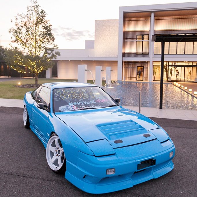 ウェルカムスペースにはミニカーやレッカー車の置物、大好きなキャラクターのぬいぐるみなどでいっぱいに飾り、エントランスには新郎自慢(笑)の愛車をウェルカムカーとして飾りました。