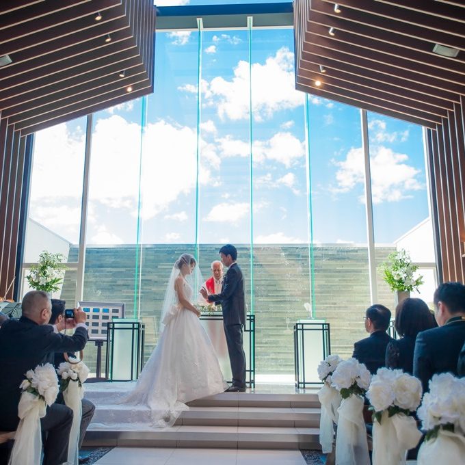 その後、案内されたチャペルを見て、会場見学で初めて涙を流しました。バージンロードの真上と正面に空が広がり、光がチャペル全体を照らしていました。‟自分達が生まれてから今までを見守ってきてくれた空へ、これからの未来を誓う”という素晴らしいお話を聞いて、絶対にここでやりたい!と強く思いました。