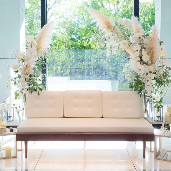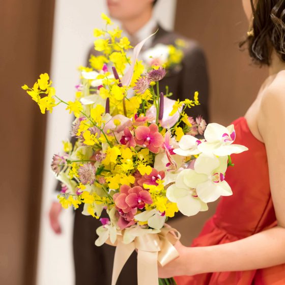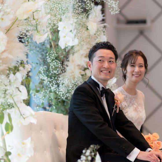 繰り返し打ち合わせをさせていただいた装花は理想通りで、ゲストとの記念写真がとても華やかになりました。
