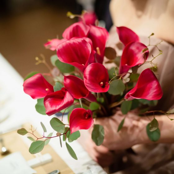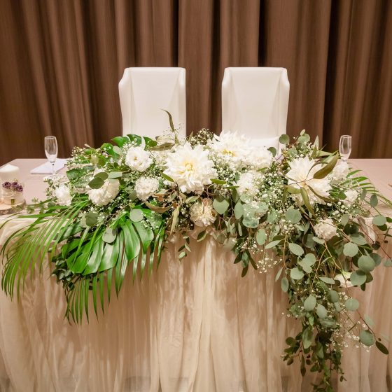 ゲストテーブルにアクリルパーテーションを設置する兼ね合いもあり、卓上装花はあえて高さを出さずに作ってもらえたので、ゲスト同士が表情を見ながら会話を楽しめていたように感じました。