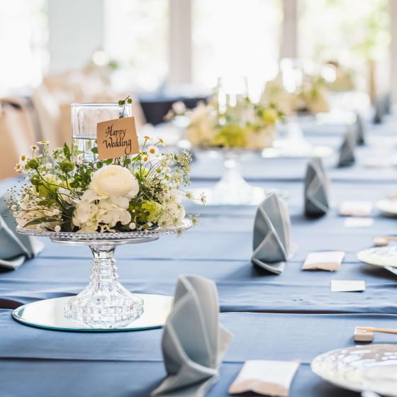 披露宴会場はテララを選びました。真っ白な会場にブルーのテーブルコーディネート、装花はシンプルにしたく白と緑を基調にお願いしました。高砂はゲストと少しでも近くが良いと思いソファを選びました。テーブルもなるべくまとまるよう円卓と流しテーブルを組み合わせてセッティングしていただきました。