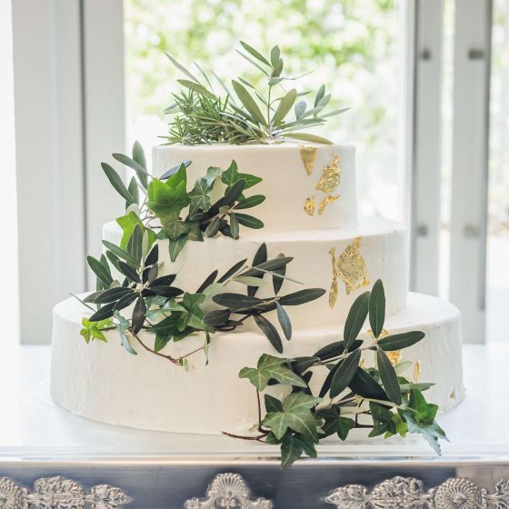 ウェディングケーキもシンプルにしたくローズマリーなどの緑を少しと、金箔でアクセントをつけて作っていただきました。