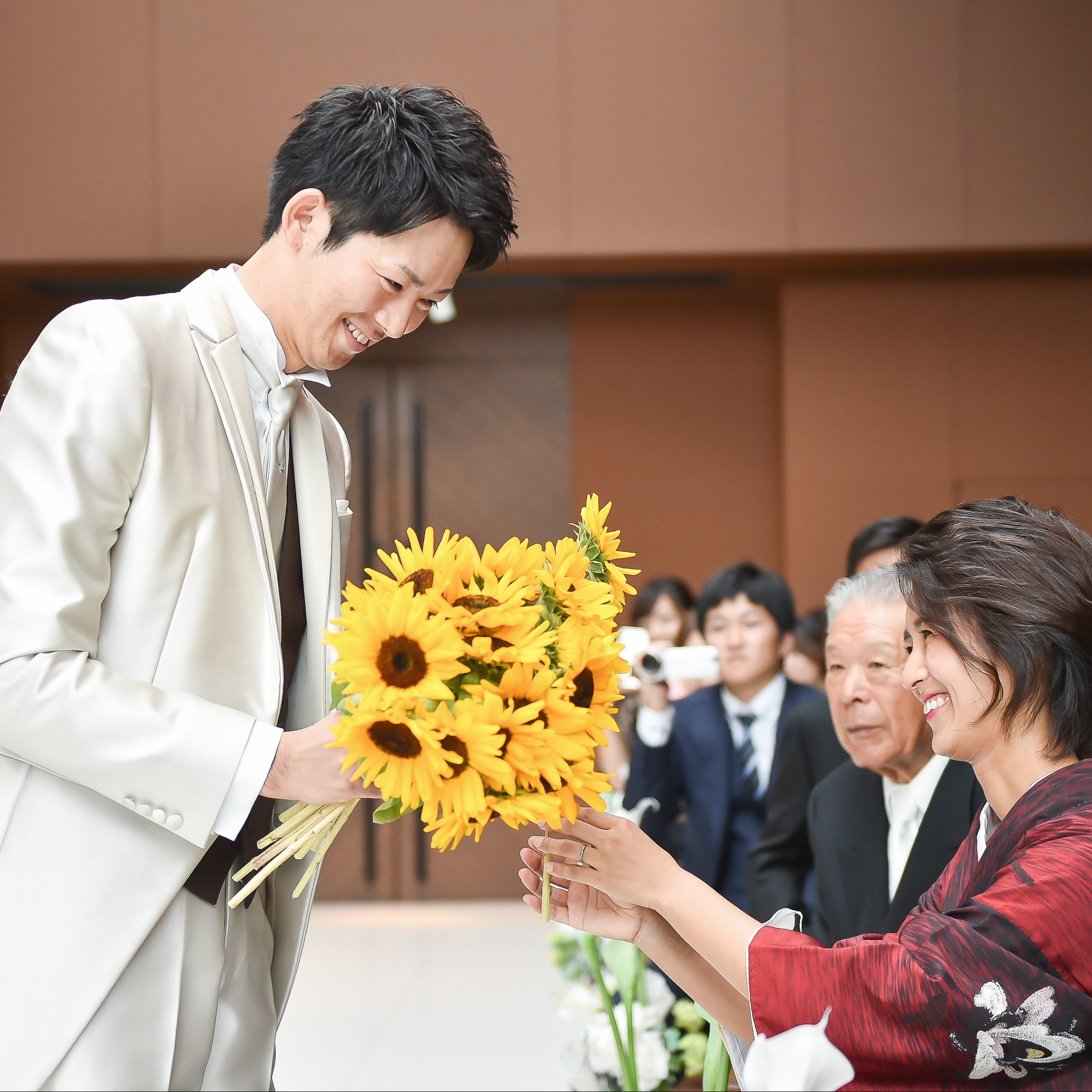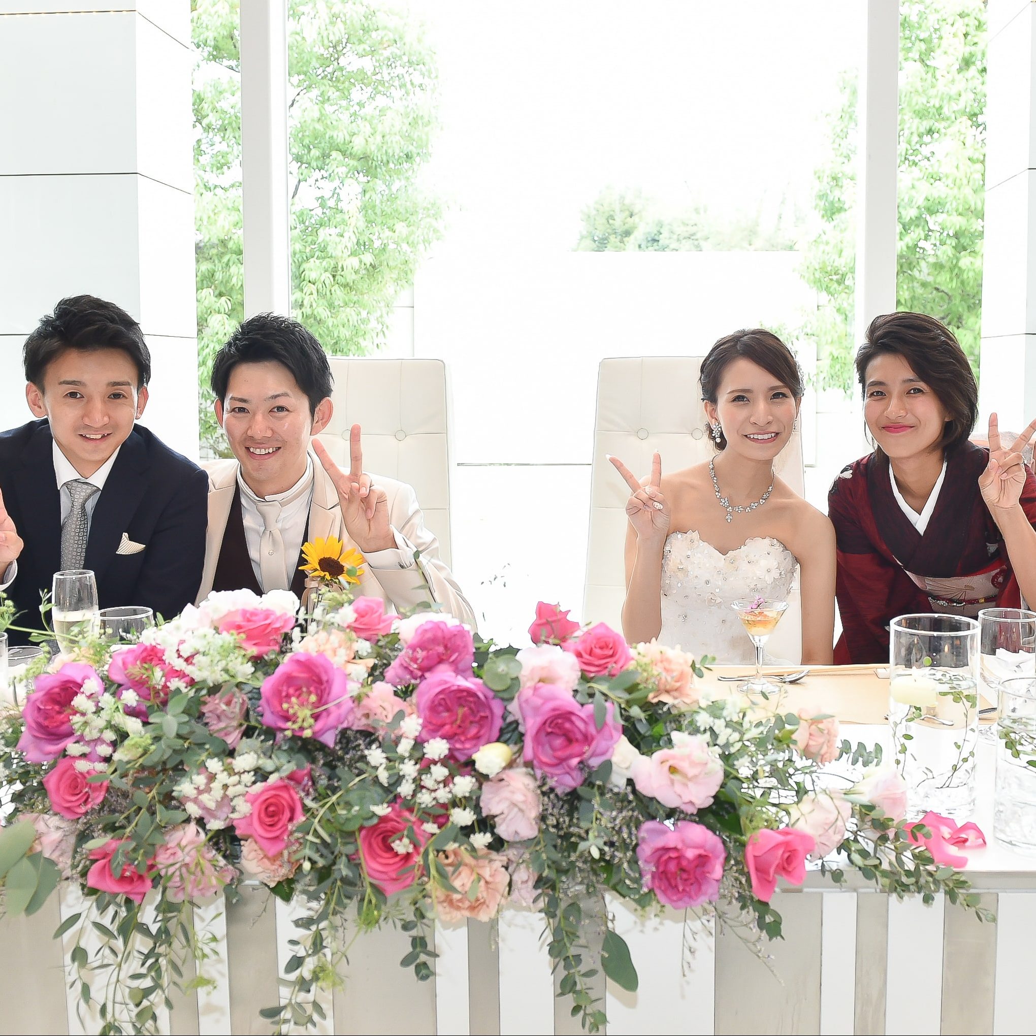 日頃よりお世話になっている皆さんへ感謝の気持ちを込めて"とにかくたのしんでもらいたい"ということと"旅行"を結婚式のテーマにして準備をすすめていきました。まず、旅行のテーマを分かりやすくするため、ウェルカムスペースや披露宴会場の装飾を旅行風にしてこだわりました。飛行機がボトルの中に入ってるお酒を買ったり、販売してない細かいアイテムは自分達で手作りをしたりと早くから準備を進めて、旅行へ行った際にはその土地ならではの物を買ってみたりと"旅行"感が溢れるように考えました。また、お互いの両親が旅行好きなこともあり、披露宴で両親へのプレゼントは"共に歩んでいきましょう"との気持ちを込めて色違いのお揃いのスニーカーにしました。いつの日かお揃いのスニーカーで一緒に旅行へ行くのが楽しみです。私たちの結婚式が連休最終日で二次会を予定していなかったため、結婚式にて全員参加型のゲームを行うことにより二次会のような楽しめる雰囲気にして、また、プレゼントを用意して日頃の感謝の気持ちを形にして表しました。プレゼントや演出でサプライズも行い楽しんでもらうことを第一に考えました。