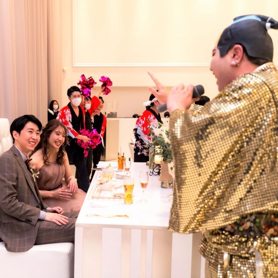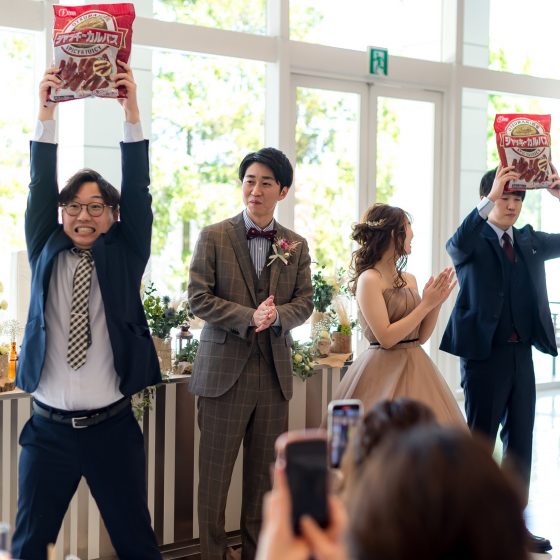 また、誰も取り残されず、全員参加で楽しめる演出がやりたくて、男性友人ゲスト全員参加のゴムパッチンプルズを行いました。「会場の一体感がすごかったね!」と皆様から嬉しい言葉をいただきました。