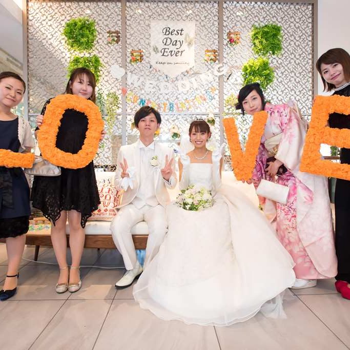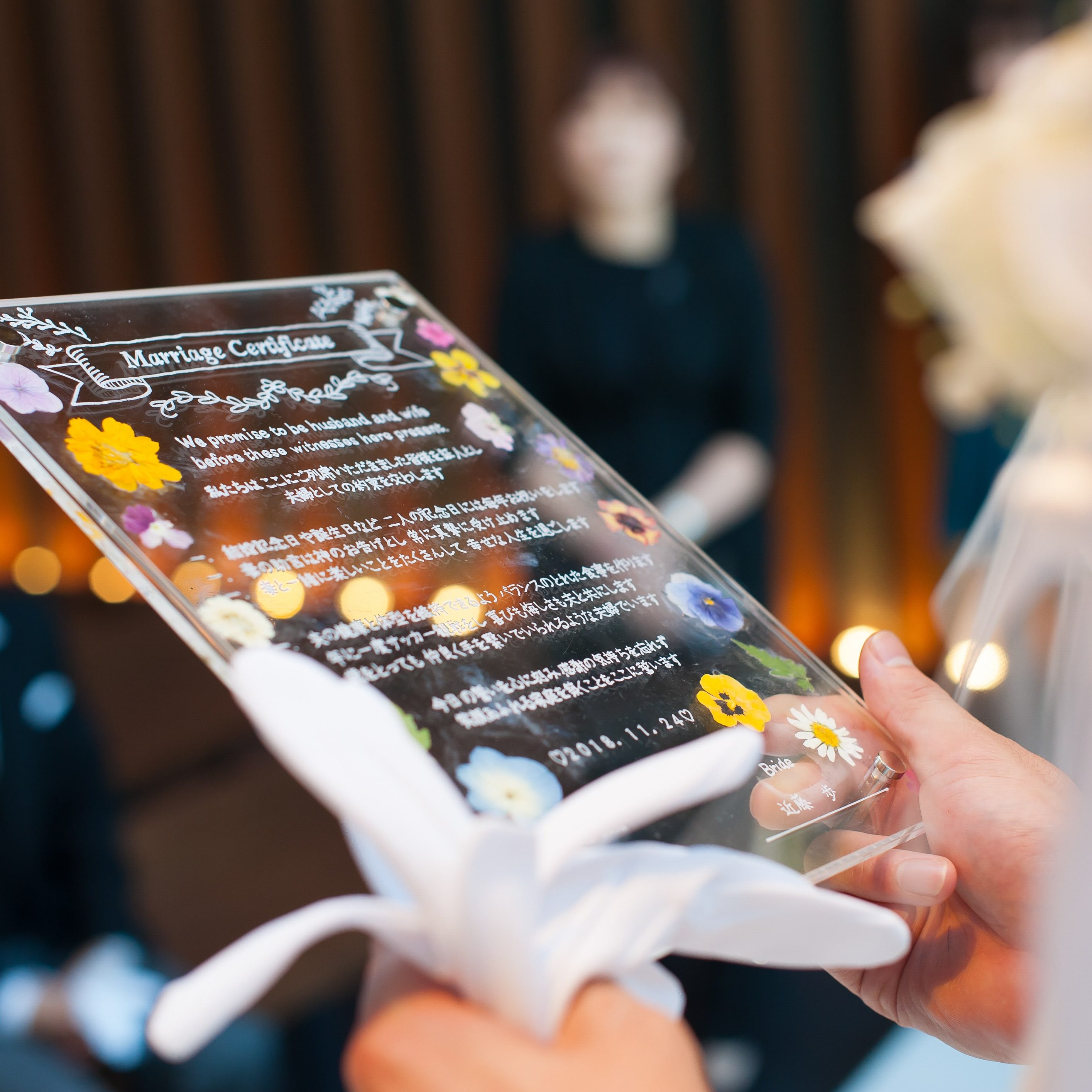 人前式では、オリジナルの結婚誓約書やリングボーイ・フラワーガールの登場であたたかい雰囲気の中行うことができました。アフターセレモニーの後に写真撮影の時間を設けたのですが、ゲストの方と話をしたりお気に入りの装飾の前で写真を撮ることができて、短い時間ではありましたがやってよかったと思っています。