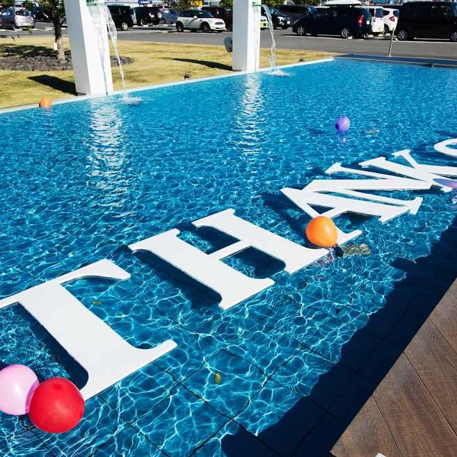 装飾は、ガーデンにはテントなどのキャンプ用品を飾り、プールには一文字90㎝四方の手作り文字を浮かべました。プールやウェルカムスペースに装飾するのを式場のスタッフの方たちも手伝ってくれ、とてもありがたかったです。