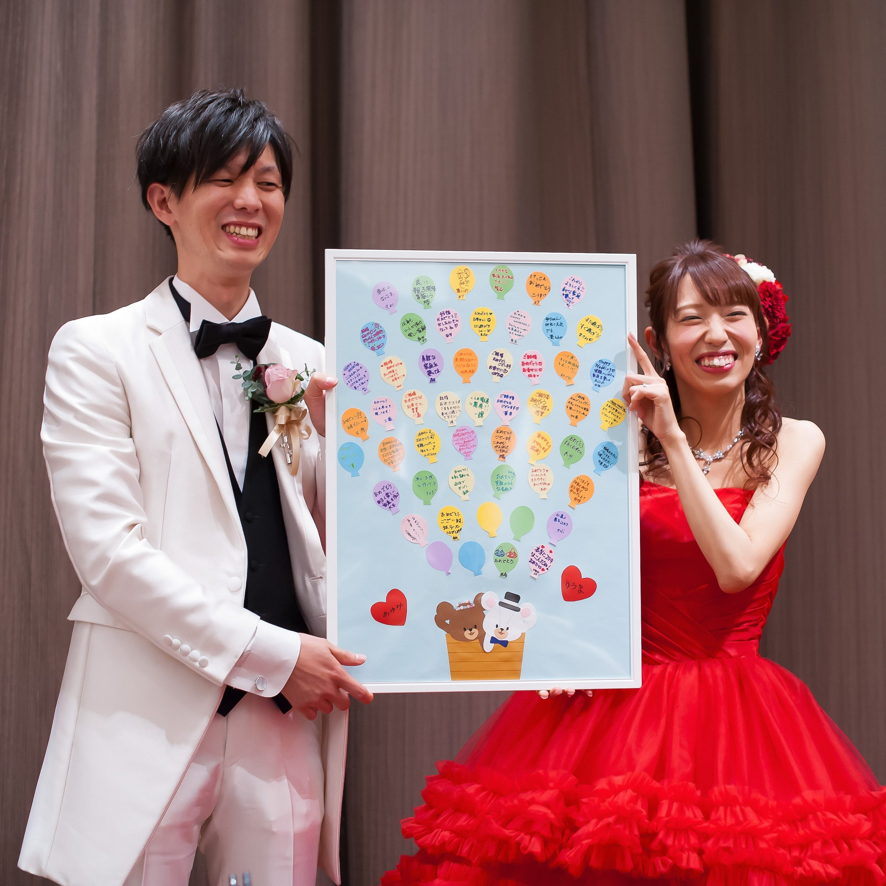 お色直し後はフォトドロップスやポーズカードを使っていろんなポーズで写真を撮ったり、受付時に書いてもらったウエディングバルーンにサインを書いたりして、ゲストと楽しい時間を過ごすことができました。両親への手紙は緊張もありましたが、普段あまり伝えられない感謝の気持ちを伝えました。ムービーを流そうか悩みましたが、やはり自分の言葉で直接言えてよかったと思っています。