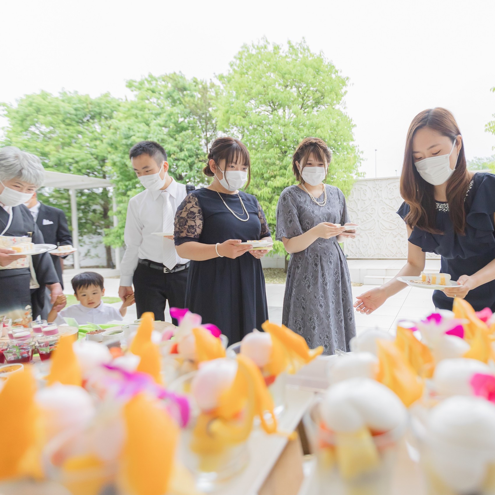 ゲストの方へのおもてなしとして、デザートビュッフェは絶対にやりたかったので、ガーデンを使ったデザートビュッフェを行いました。シェフと相談をして、料理やデザートを好きなキャラクターモチーフにしてもらい、ゲストの方にも喜んでもらえました!
