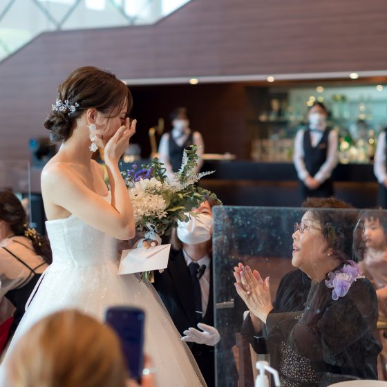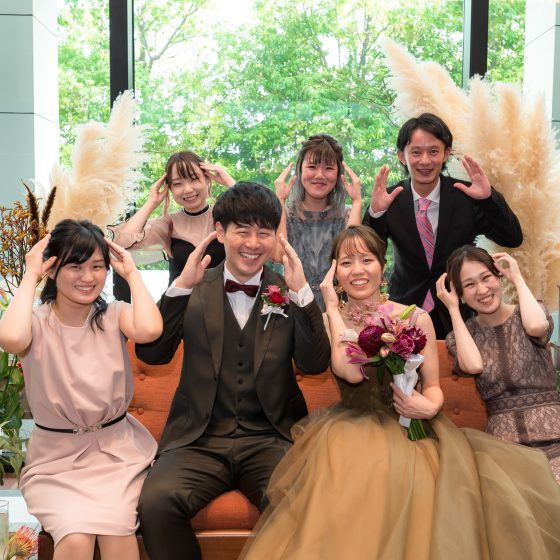 披露宴の会場の雰囲気、特にソファー席は自分達の想像以上に華やかで心踊らされました。コロナ禍で会えなかった友人や親戚の顔を見ると自然と笑顔になりました。余興では、トイレットペーパー早巻き大会が大いに盛り上がり、多くの方から「物凄く楽しかった!」との声をいただきました。
