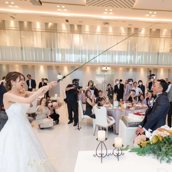 ファーストバイトは、「誰もが未だかつて見たことないだろう」という考えから、釣り竿ファーストバイトをして楽しませたり、常にゲストが退屈しないような結婚式を意識しました♡