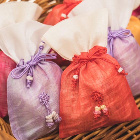 引出物は、「和」を感じる物を選んだため、プチギフトには、韓国の福巾着(ポクチュモニ)に韓国のお菓子をいれて用意しました!
