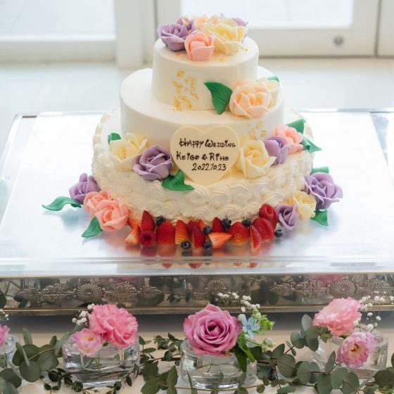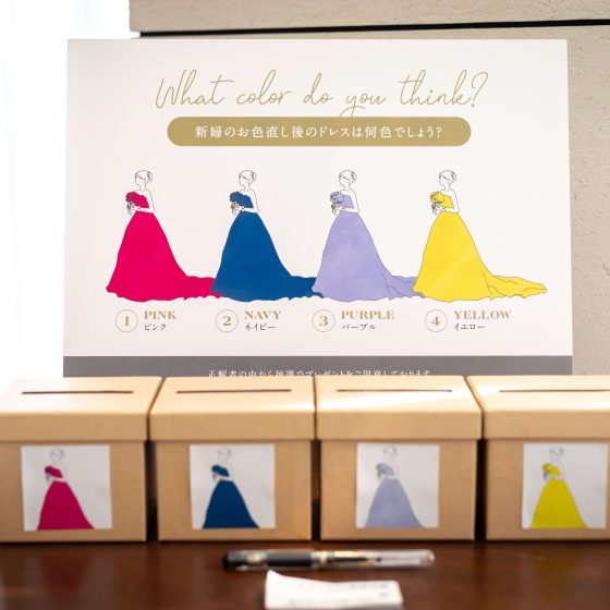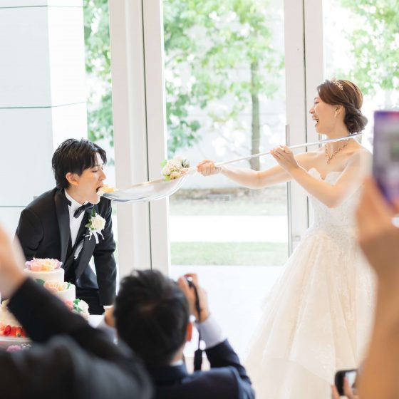 2人の好きな物を存分に取り入れて演出したいと決めて、ドレスや会場の飾り付け、料理とウエディングケーキのデザインなどにこだわって準備しました。また、主役2人だけではなくゲストも一緒に楽しんでもらいたいと思い、お菓子撒きやドロップ&フライなど、ゲスト参加型のイベントをたくさん用意しました。