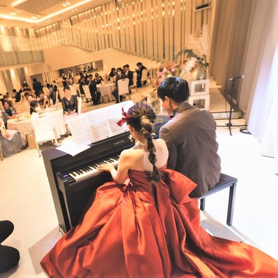 新婦の私は 小さな頃から多くの習い事に通わせてもらっていて、その中でもピアノは人前で弾く機会もあり、自分への自信になる場面が多くありました。これも長い間 習わせてくれていた両親のおかげ。その感謝の想いをピアノのメロディーに乗せて届けられたらいいな、同時にゲストの皆様へのサプライズになったらいいな、とピアノ演奏を考案しました。(新郎は完全にピアノ初心者でしたが、たくさん練習して頑張ってくれました!)