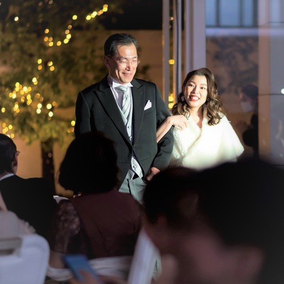 サプライズでドレス姿でお父様とご一緒に歩かれました