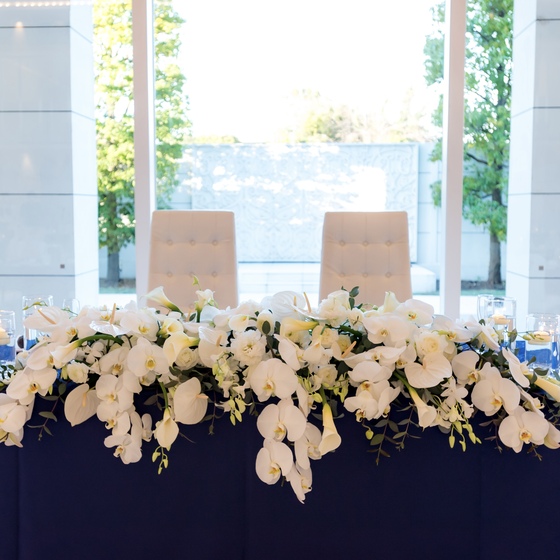 披露宴では装花で絶対に使いたかった胡蝶蘭を取り入れ、キャンドルを沢山使用し、シンプル且つゴージャスな雰囲気となるようこだわりました。