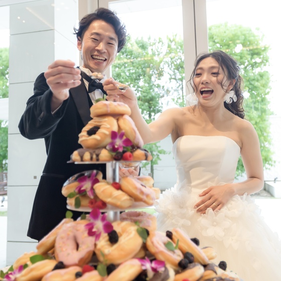 ゲストの方に喜んでいただきたいので料理とウエディングケーキもこだわりました。ウエディングケーキは、ドーナツタワーにしたかったので、担当プロデューサーへどうにかできないかとお願いをしました。予算もあったので難しいとも思いましたが、担当の方が相談を聞いてくれて予算内かつ私たちも満足のいくドーナツタワーを当日用意してくれました。