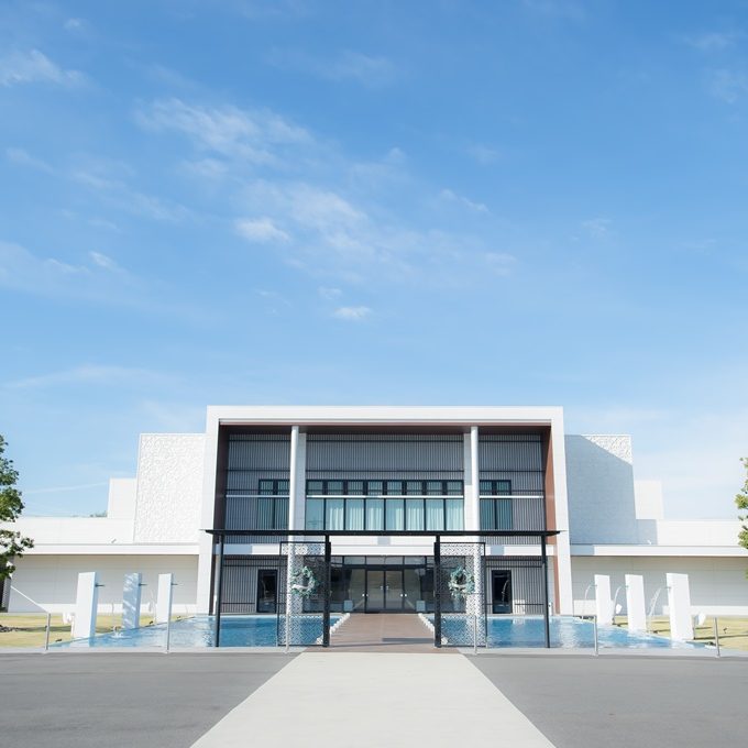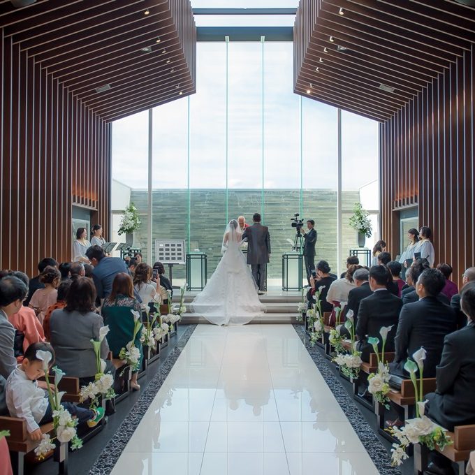 雑誌を見てて、ブライダルフェアをやってたところがリーヴスでした。まず、チャペルが好みのガラス張り、木目のルーバーがとても素敵だなと思いました。披露宴会場もガラス張りがいいなと思っていて、テーブルクロスは好きな色にコーディネートできることを知り、まず見学に行ってみました。