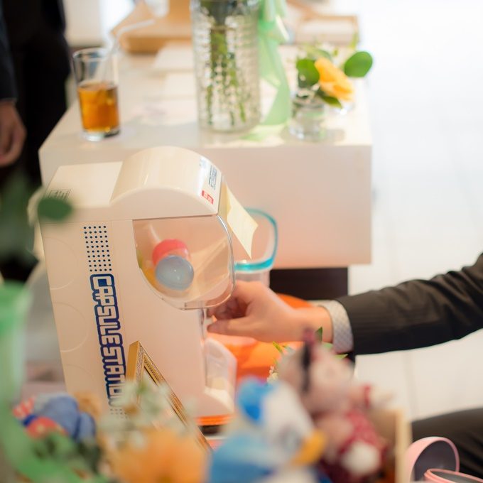 私たちの結婚式は、「スタジアムリゾートウェディング」というテーマでした。野球と夢のテーマパークが好きなので、ウェルカムボードは、野球のスコアボードに見立てて作りました。子供が喜ぶように、おもちゃのUFOキャッチャーも置き工夫しました。また、披露宴での席の配置は、球場のグランドを見立てるよう、緑と茶色のテーブルクロスを使用し、野球感を出しました。ナフキンは、ふたりが好きなキャラクターの形にしていただきました。ウェディングケーキも球場風にしてもらい、キャラクターのフィギュアを置いて選手として見立てました。料理もこだわりました。メニュー表には、料理長の提案のもと、キャラクターと野球に関連した料理名にし、イメージして作っていただきました。