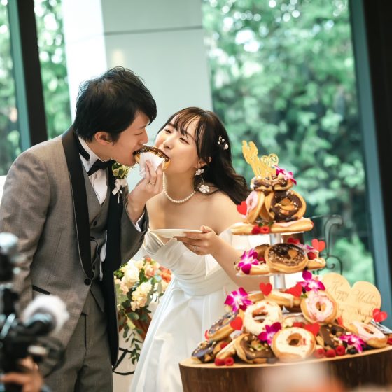 定番のケーキ入刀→ファーストバイトではなく、“これからも美味しいものを一緒に食べていこうね”という意味を込めて、2人一緒に1個のドーナツにかぶりつきました!