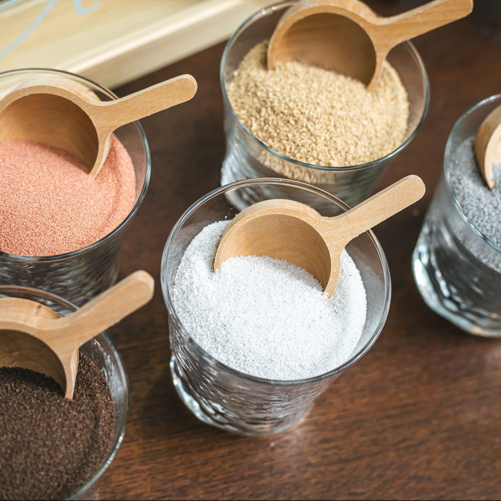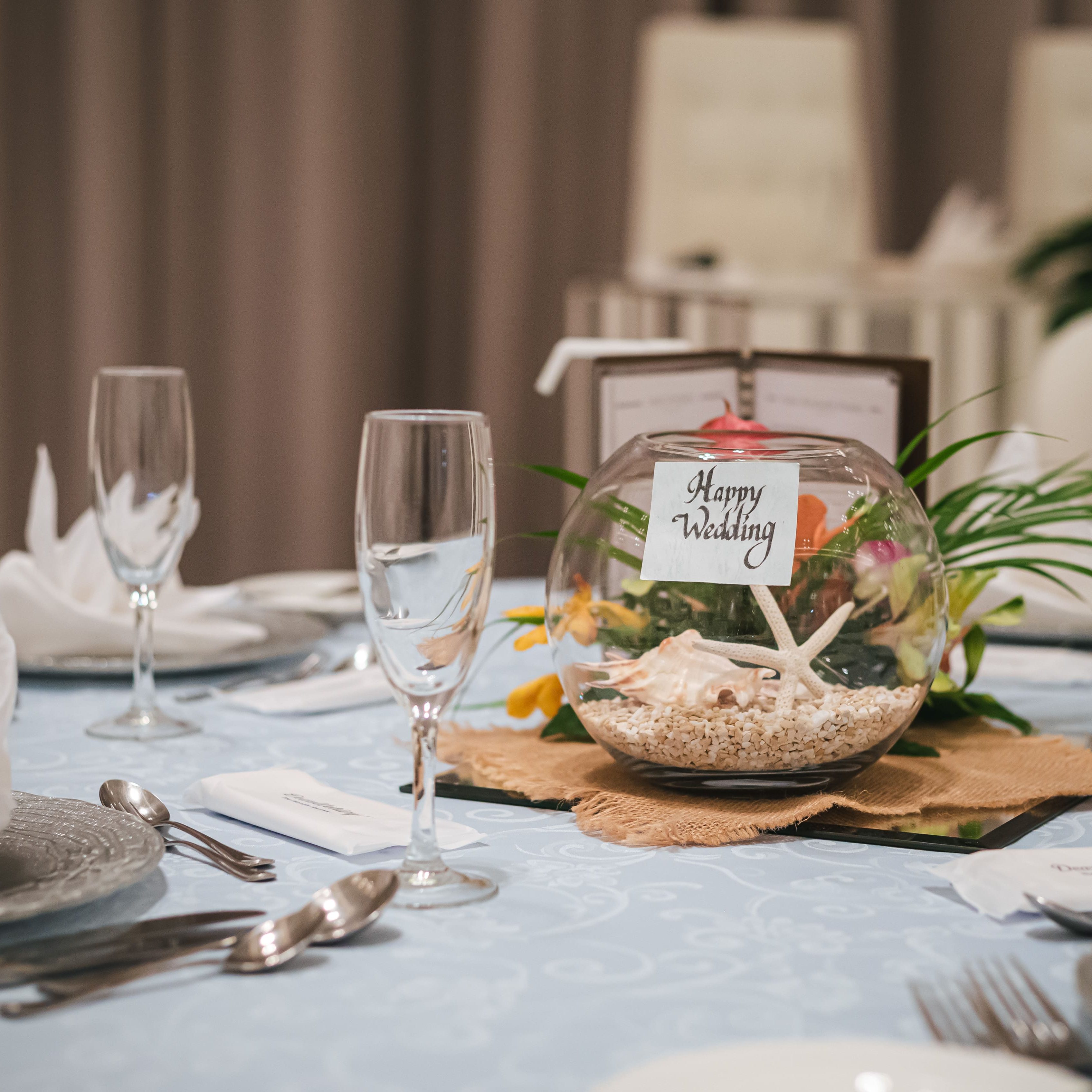 summer・リゾート感を出したかったので、テーブルクロスなどはブルーや白などにし、飾り付けもリゾート感出すように貝殻や砂浜などを意識し作っていただきました。