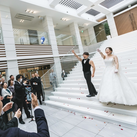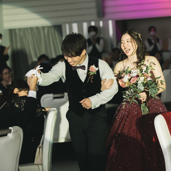 新郎の趣味が筋トレなので、筋肉に関するブーケトスや音楽を使って、個性のある式になるようにウエディングプロデューサーの田村さんと相談しました。