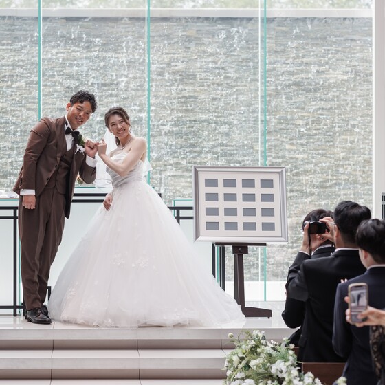 挙式は堅苦しくない自分の好きなようにできる人前式にしました。また、誓いのキスではなく指きりげんまんにして、最後にクロージングキスにしました。