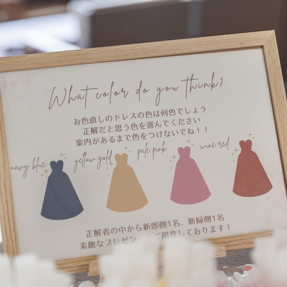 披露宴はLIVEぽくしたかったのでウェルカムスペースにペンライトを用意し更にドレス当てクイズも一緒にしました。再入場では、ダンスもしたかったので好きなアーティストの楽曲に合わせて踊りました!ドレスの色を当てた方には、景品を用意したり、音楽にも自分の好きと友達の好きをどっちも取り入れて笑顔溢れる式になりました♪