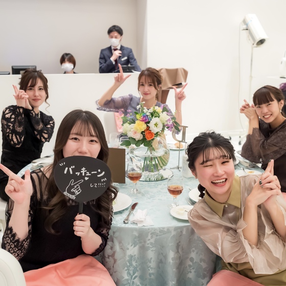私たちが1番こだわったのは、お花です。盛大さを出すため、お花を沢山飾っていただきました。また、私たちのお気に入りのお花のレインボーローズを活用したことで、写真映えをイメージし、より華やかで盛大さを出すことができました。またゲストにも楽しんでもらうよう、ドレス色あてクイズや、ブロッコリートス、歓談の時間を長く設けるなどと、盛り上がれるシーンをたくさん取り入れました。まさにスマイルテーマ通り、「驚き・感動・華やか・そして盛大な進行」で、結婚式ができました!