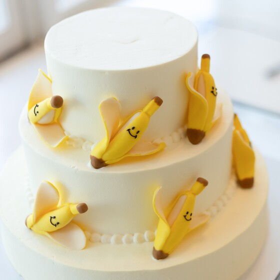 ウエディングケーキは、私たちが好きなチョコバナナをモチーフにしました。