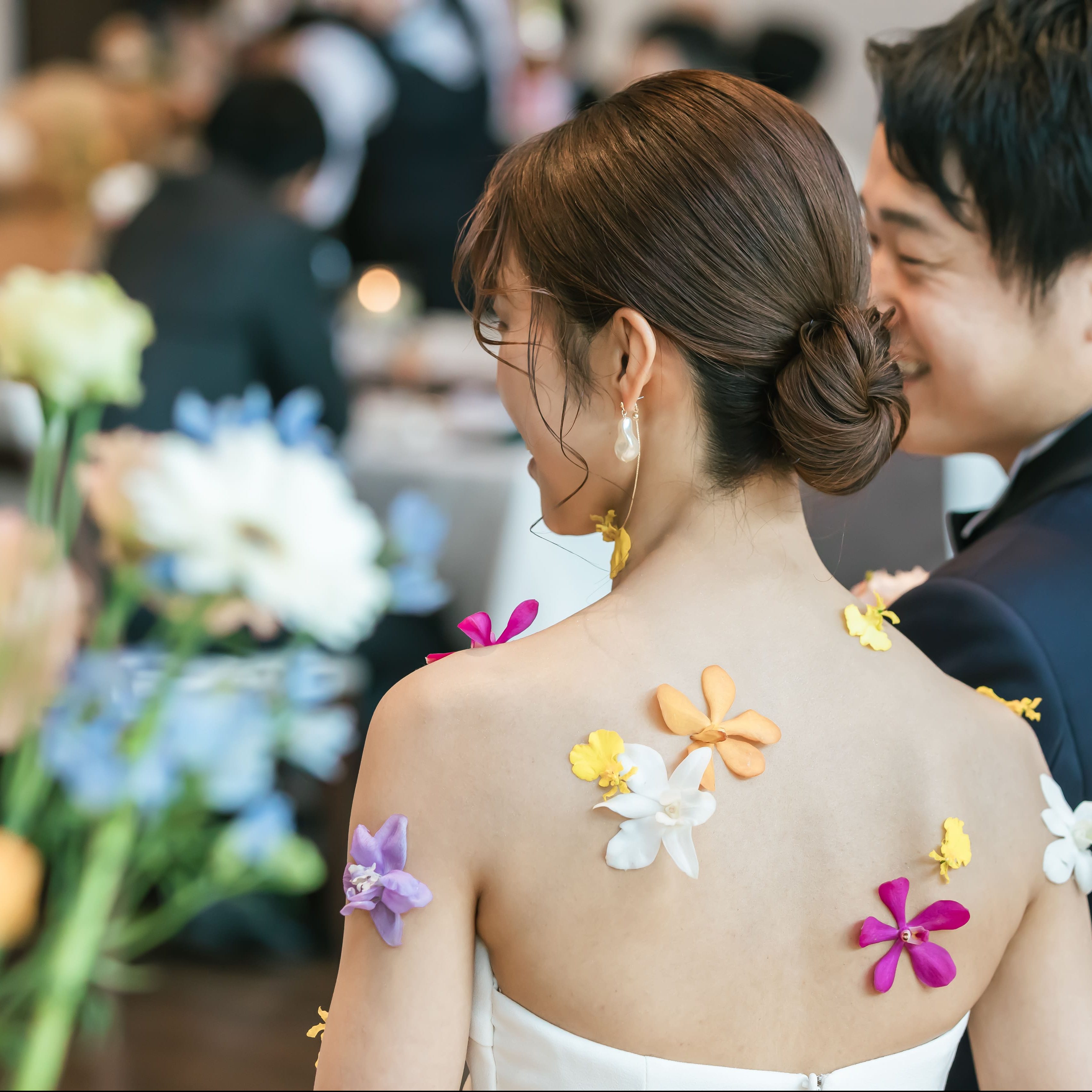 衣装は、ウエディングドレスとカラードレスは、テラコッタのドレスを着ました。披露宴前の少しの時間でボディに生花をつけ、お花が大好きな私らしい衣装へとチェンジしました。装花やヘアメイク担当の方と相談をし実現できたこと、大変嬉しく思っています!