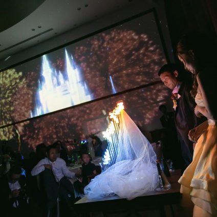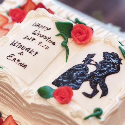 ケーキは、美女と野獣が大好きなのでこちらも色々と要望を伝え、とても素敵なケーキにして頂きました!!ファーストバイトでは、私の職業と関連させて手作りのスタイ、大きなシャベルを用意して行いました♡