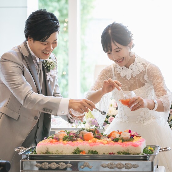 スタッフの皆さんがサポートしてくれて、あれよあれよと準備が完了。素敵な司会で始まったガーデン人前式は、ゲストとの距離がとても近く、披露宴でのお祝いちらし寿司やライブキャンバスもとても盛り上がりました。