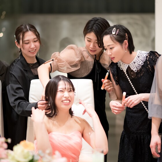 自分たちだけではなく、ゲストにも楽しんでもらうためにウェルカムスペースからワクワクしてもらえるようドレスあてゲームなどの準備をした。