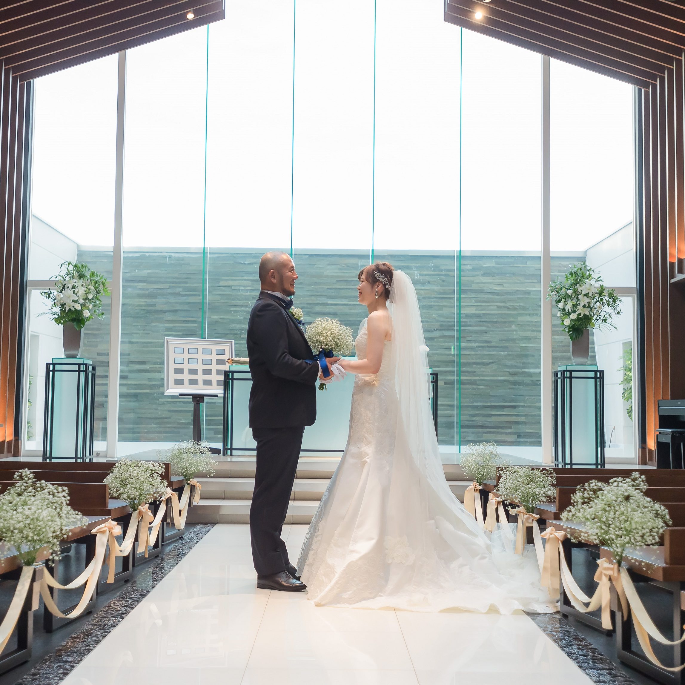 仕事の関係で、数回列席として伺っておりましたが、白、茶、グリーンを基調としたシンプルな雰囲気に惹かれていました。仕事上、緊急や休みがとれないこともあり、また職場関係のゲストも同様であり、立地のうえでもベストでした。でもいちばんはタイミングでした。おつき合いして2カ月あまりで結婚をきめ、3ヵ月目からタイミングよく一緒に暮らし始め、結婚式のことを考えはじめた矢先に、式場見学は早めにいくべき!という周囲の御言葉から、じゃあと思い立って予約して伺うことになった、はじめの式場でした。チャペルに入る前の、サプライズmovieのこと、バージンロードの意味、そして何よりも、大好きな空が近くて、刻一刻と表情をかえる風景に感無量でした。その日、偶然にも10月に空きがあり、勢いで決めさせていただきました。