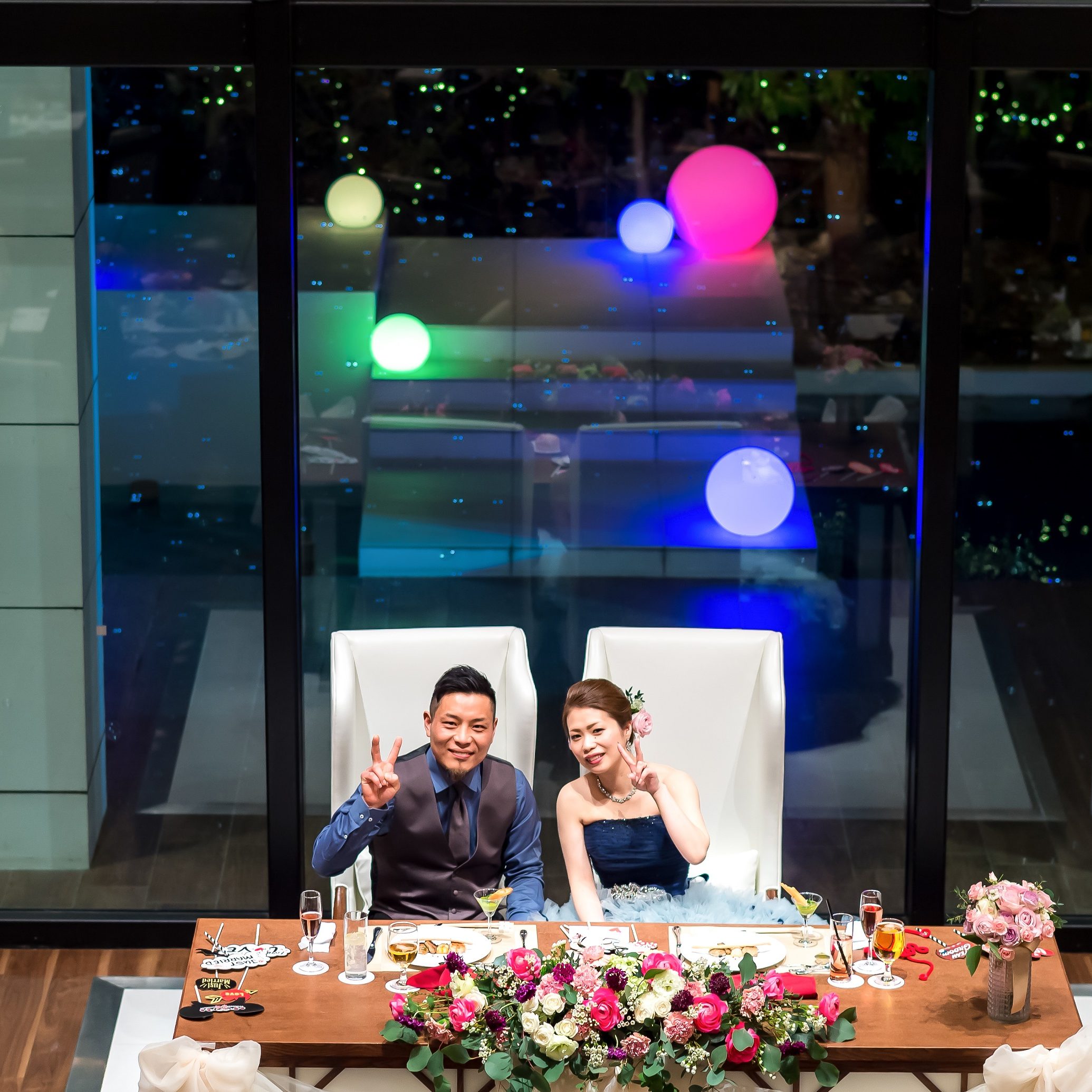 披露宴はアクアを利用しました。会場を見せて頂いて即決でした。理由は二階から階段を降りながら入場ができるところとガーデンと繋がっている全面ガラス張りの造り、落ち着いたブラウンの空間がとても素敵だと思ったからです。天候に左右されず全て室内で行えることも良かったです。