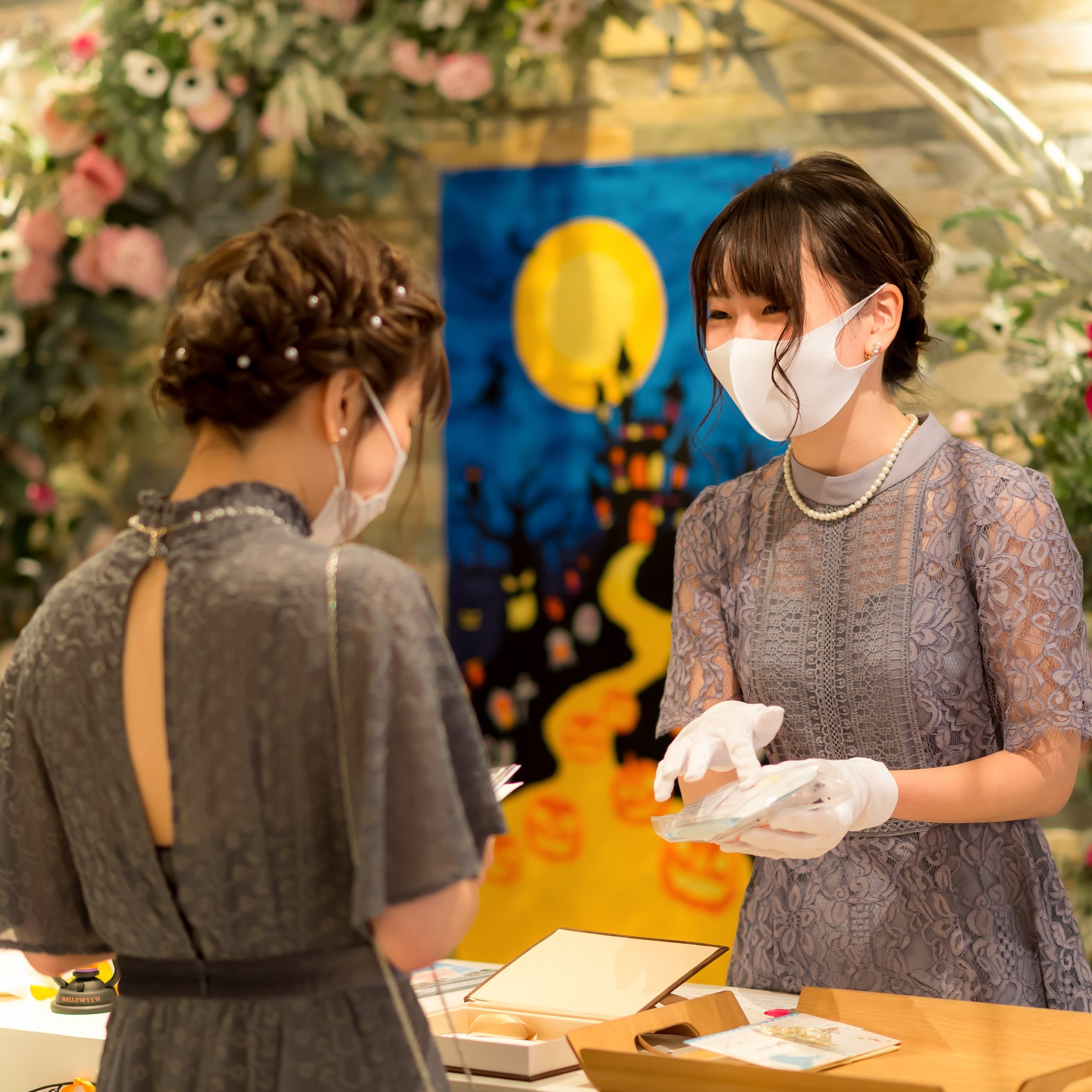 一番大切にしていた軸は、結婚式の世界観とゲストと一緒に作り上げるというテーマです。まず、エントランスから自分たちの選んだBGMを流し、到着してすぐ、耳でまず楽しんでもらえるようにしました。ウェルカムスペースには、ぬいぐるみやハロウィングッズを置き目で楽しめるようにしました。また、ゲスト用とスタッフ用でネームプレートを作成し、参加する側ももてなす側もみんなで一緒に楽しもう!という気持ちになれるような雰囲気づくりにもこだわりました。席次表などのペーパーアイテムもオリジナルで作成しました。