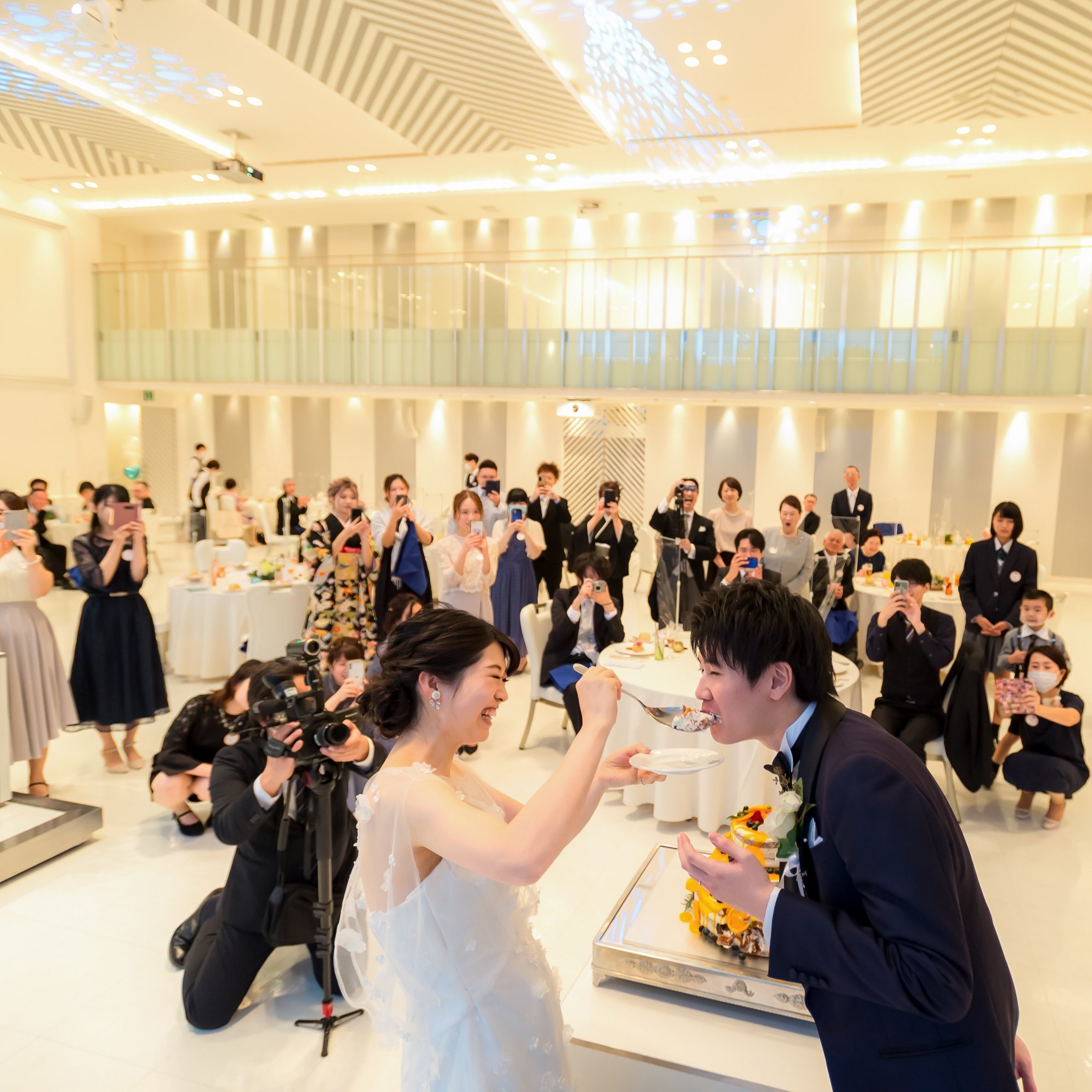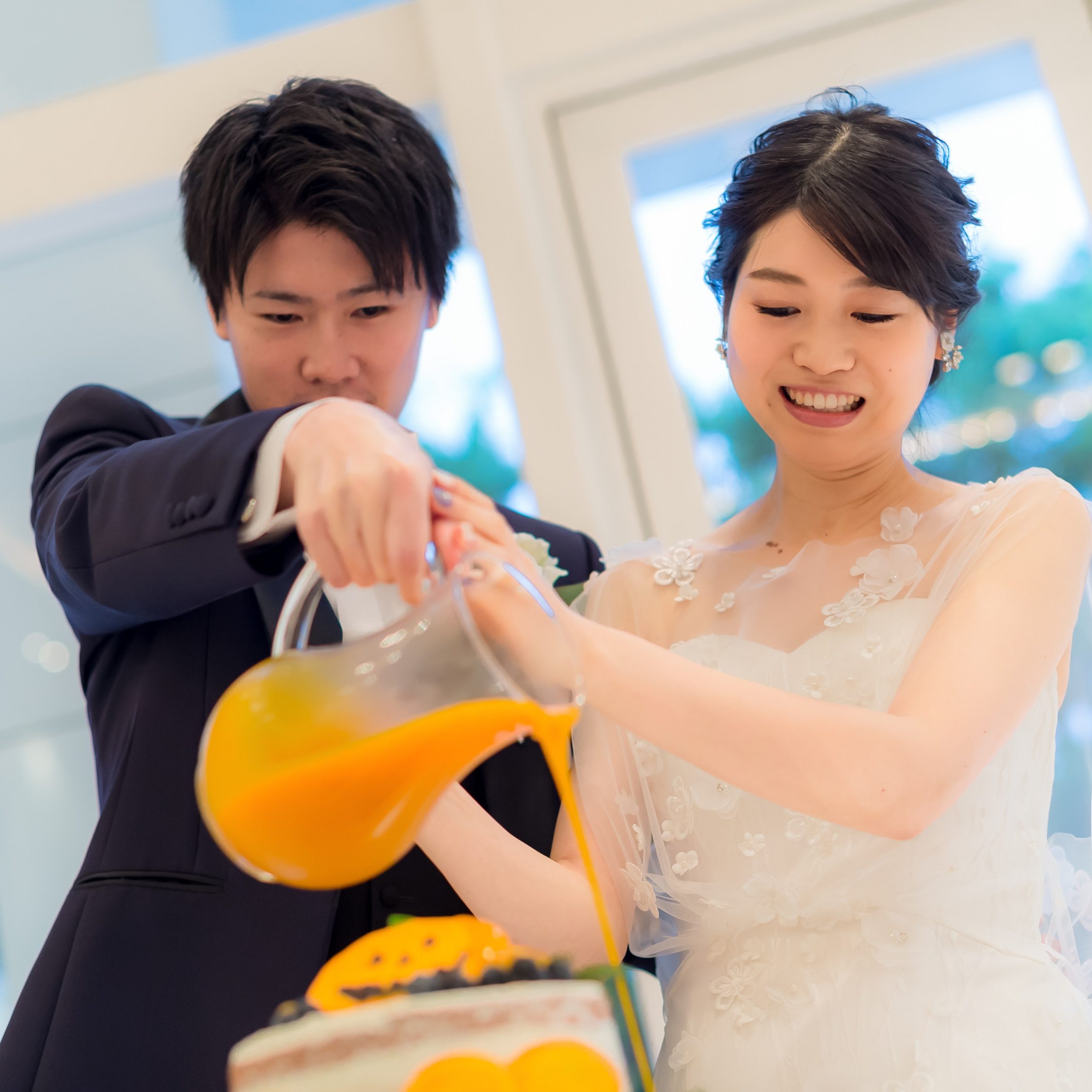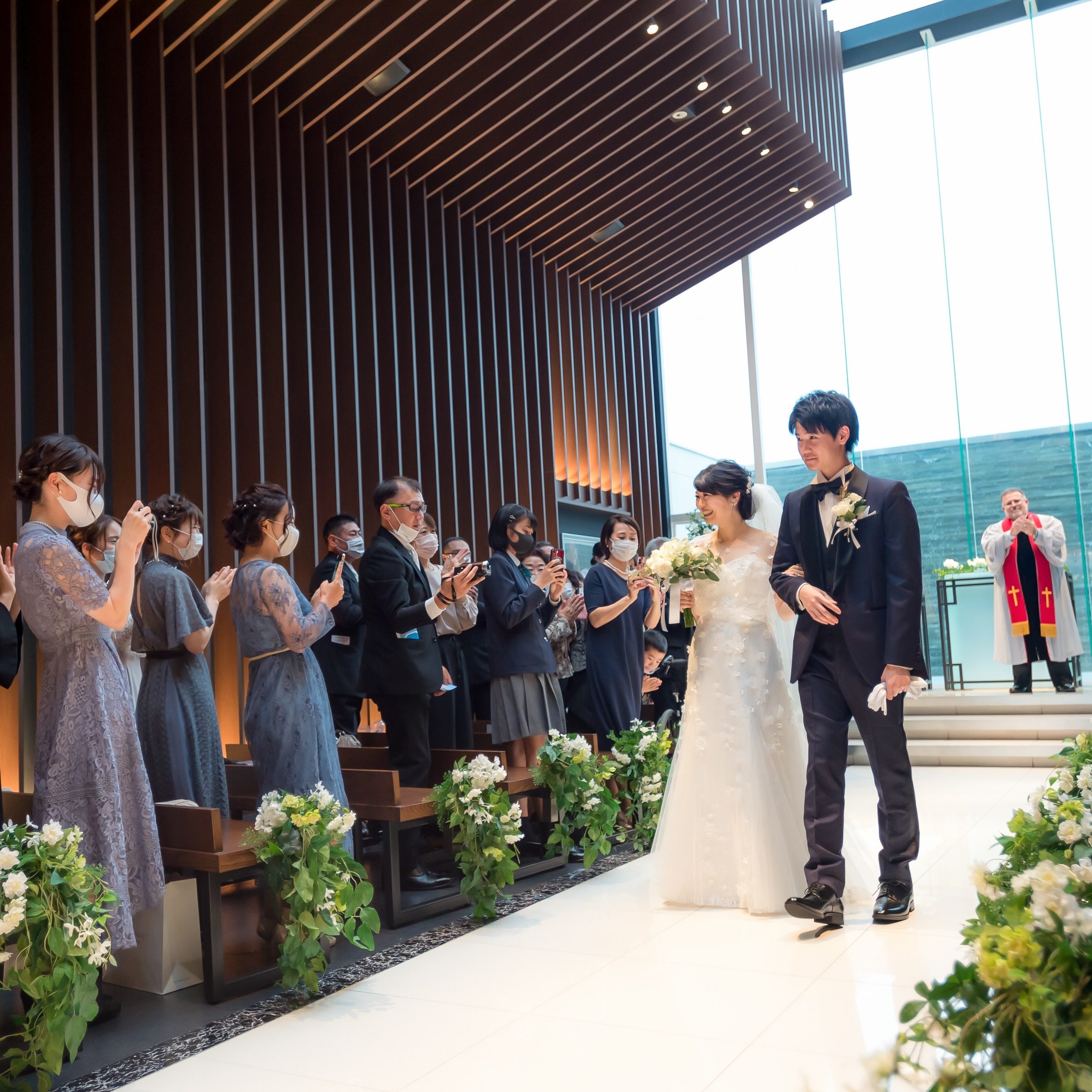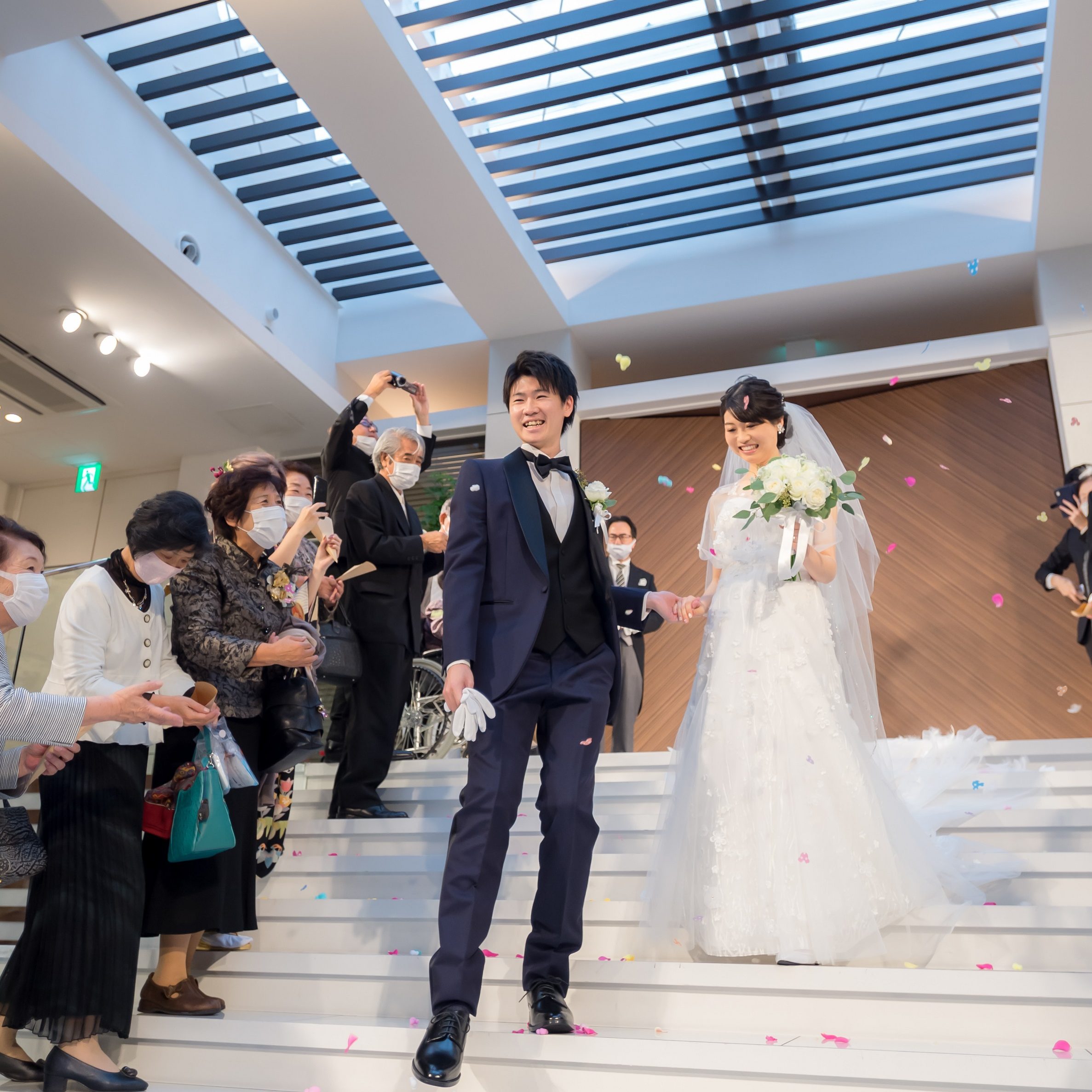 挙式では、入場で扉が開くと友人の顔が見え、そこで結婚するんだなと実感する自分がいました。友人に親族に一人一人の顔が見え、すごく幸せな気持ちでした。アフターセレモニーではお菓子まきをしたのですが、ゲストみんなが手を上げてくれたりして、みんなで参加してるという嬉しさがありました。披露宴でも、入場するまで緊張していましたが、入場してからはあっという間で、みんなの笑顔が見れて、また、おめでとうと言ってもらえてすごく幸せで、終始感謝の気持ちでいっぱいでした。
