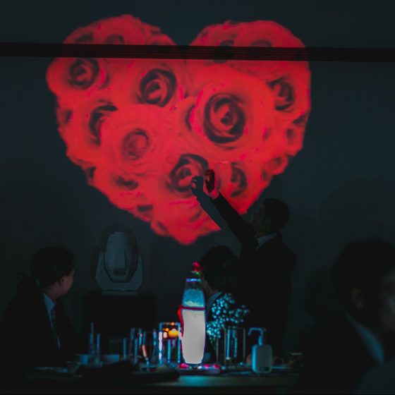 晩餐会というテーマを元にとても世界観にこだわりました。テーマを崩さないよう統一感を出すため使用する曲は洋楽やクラシックのみ。装花や小物、ペーパーアイテムなどもすべて薔薇を使いました。晩餐会のイメージを出すためにテーブルランナーの持込の許可もいただきゲストテーブルはイメージ通りの仕上がりとなりました。また、海外での挙式を済ませていた私達は海外の文化でもあるファーストダンスを日本の結婚式でも披露。1年以上レッスンを続けた1番の見せ場でもあるファーストダンスの演出は、曲のタイミングからマッピングの映像、細かなところまでこだわりました。マッピング映像でシャンデリアが回っているように作ってほしいというわがままな依頼に【出来ませんでした。という回答はしません。頑張ります!】などと言っていただいたことを鮮明に覚えています。完成したマッピング映像を見た瞬間鳥肌が立つほどでした。素晴らしいクオリティでした。光の演出はサザンクロスを元に雰囲気作りをイメージしました。光の色や光るタイミングなどで雰囲気は作れる。これはザ・リーヴス プレミアムテラスだからこそ出来る技術と完成度だと感じました。