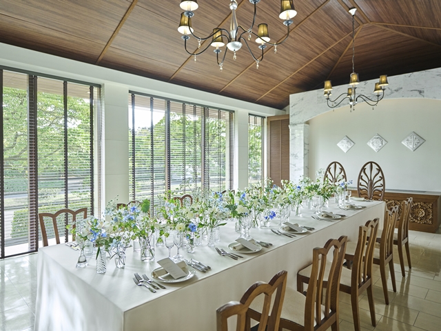 アクアテラスに浮かぶプライベートヴィラ「コンサバトリールーム」(着席30名迄)。 繊細なレリーフや豪華なシャンデリアなど、洗練されたインテリアが印象的なプライベート空間は、少人数でのウエディングパーティーや、アフターパーティーにもご利用いただけます。