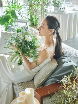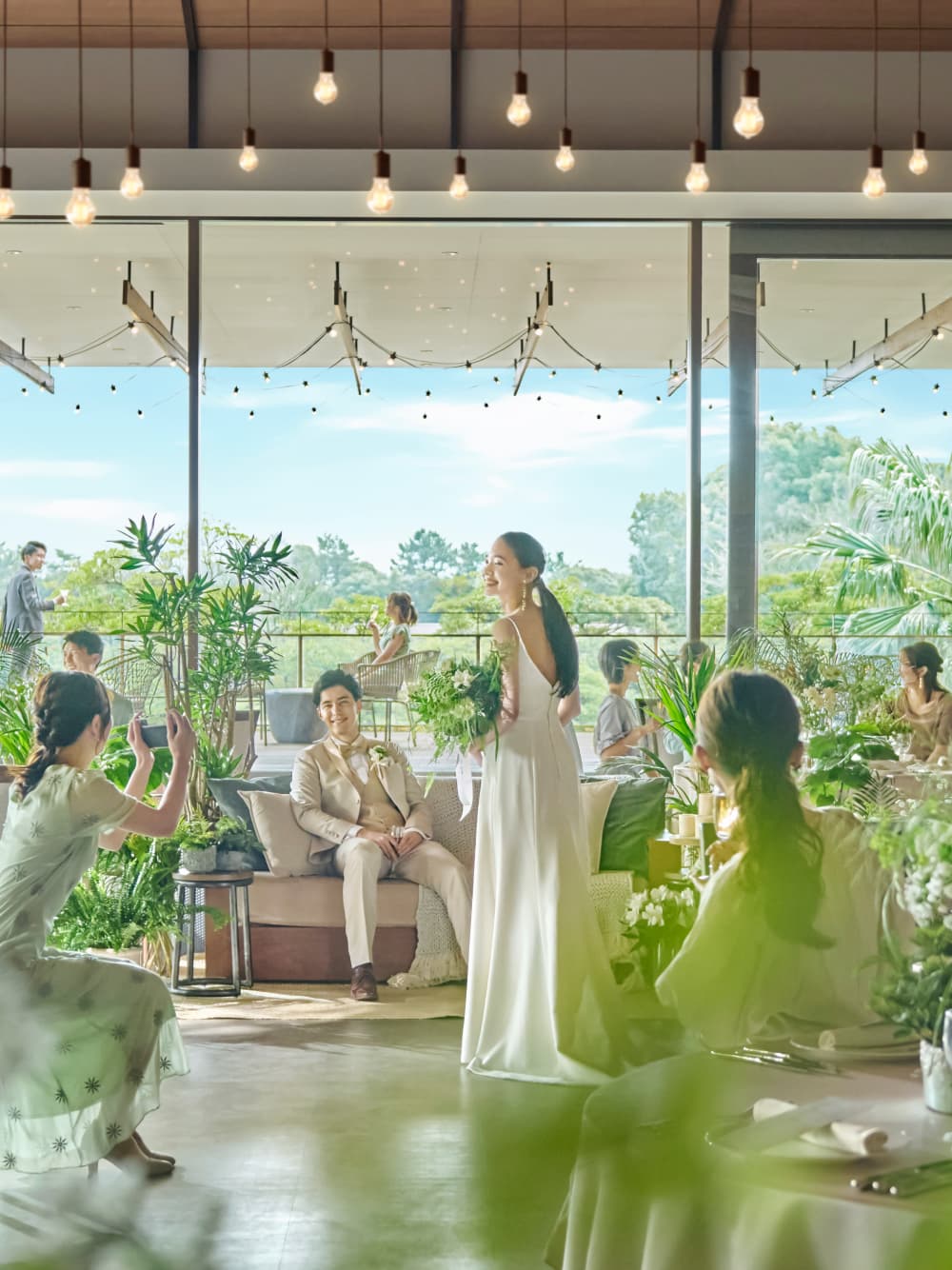 開放感あふれる大きな窓に、豊かな緑と空の美景が広がる2階の邸宅「CASA PLUMERIA(カーサ・プルメリア)」。木目が特徴でナチュラルなバンケットと、潮風を感じるオープンテラスを自由に行き来しながら、心がはずむ幸せなパーティーをお愉しみください。