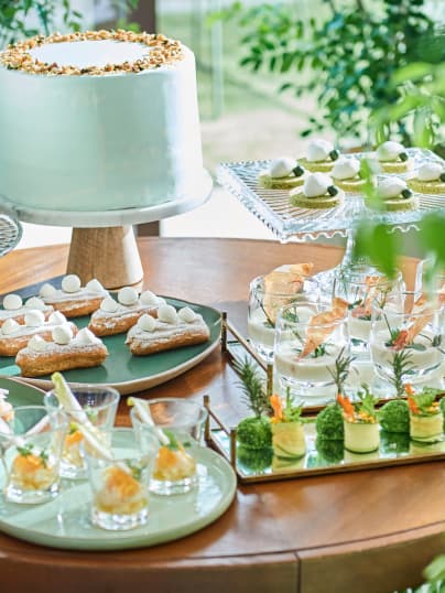 バンケットと壁一面の窓で繋がったオープンテラスでは、デザートブッフェやサプライズ入場などの演出はもちろん、ゲストとゆったり会話を愉しむリラックスしたおもてなしも叶えていただけます。大空と一体となった開放的でナチュラルな空間は、おふたりとゲストに心地よいひと時をお約束します。